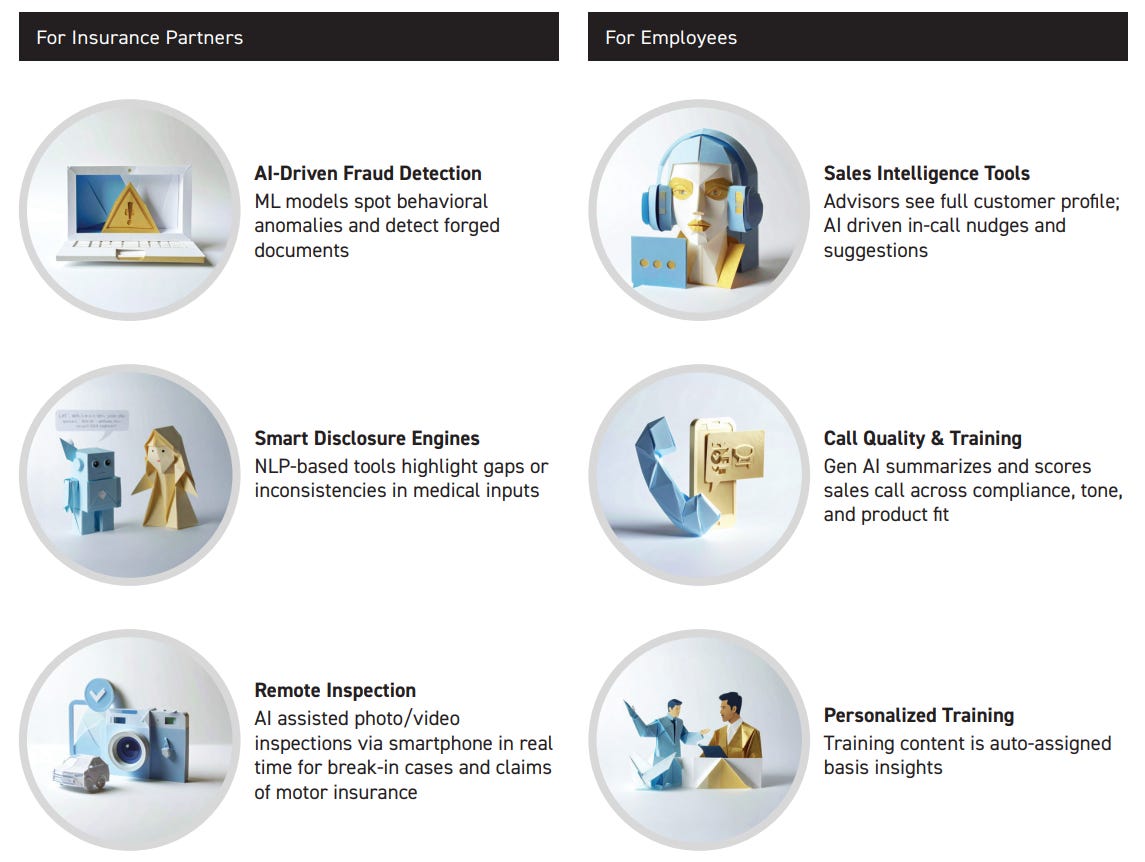For insurance partners, AI strengthens core risk and operations through fraud detection, NLP-based disclosure checks, and remote photo/video inspections that speed up break-in cases and motor claims.