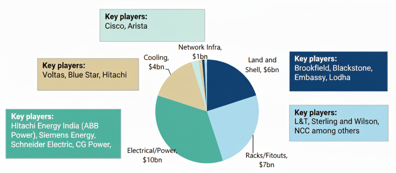 Builders (~15%): real estate developers, design firms, and construction companies that build, expand and upgrade DCs, such as global companies like DPR Construction, Mercury Engineering, and Indian companies like STT GDC India, Yotta Infrastructure, NTT Global DCs; and EPC players like AECOM, Sterling & Wilson.