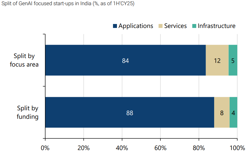 While application layer does match the country’s structural strengths (due to services orientation of our economy), infrastructure investments are rare due to their capital-intensive nature that requires certain scale. Foundational layers continue to be dominated by global hyperscalers and model providers, where as startups in India tend to build on top rather than compete head-on.