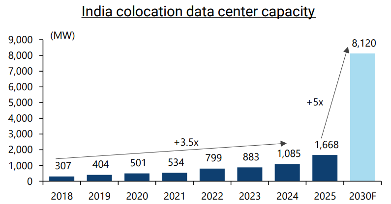 Hence, India’s data center capacity is set to jump 5x to 8GW by 2030 over 2025, which could require facility capex of $ 30bn (ex. servers) fueling 5x jump, as per Jefferies.